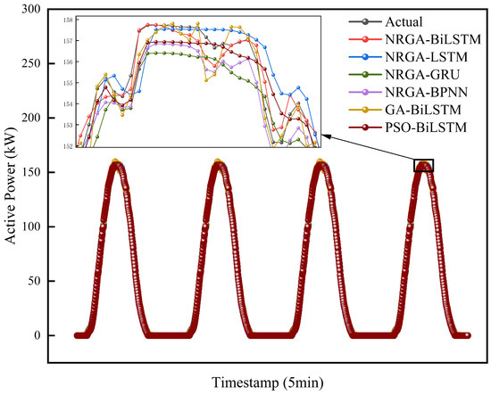 These results show that the prediction accuracy of the NRGA-BiLSTM method is generally higher than the other comparative models. BiLSTM has the lowest error for the other models under NRGA optimization, with a reduction of 18.4%, 19.5%, and 42.7% in MAE, 22.4%, 28.3%, and 37.7% in RMSE, 18.1%, 23%, and 49% in MAPE, respectively, when compared with the LSTM, GRU, and BPNN models. It has been attributed to the unique bidirectional temporal memory structure of BiLSTM, with a better ability to extract multiple time series features. In addition, the model prediction error after NRGA optimization is lower than that after both GA and PSO algorithms. In the BiLSTM model, the MAE after NRGA algorithm optimization is lower than that after GA and PSO algorithm optimization by 1.41% and 2.35%, the RMSE is lower by 2.41% and 5.58%, the MAPE is reduced by 5.18% and 7.58%, respectively, and the trends presented in the other models are more or less the same. In summary, PSO is more likely to fall into local optimality than GA, leading to a more significant prediction error. While NRGA is optimized based on GA, the ability of global and local optimality search is improved.