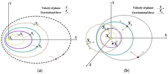 where denotes the orbital period of the planet . In our proposed algorithm, it is assumed that the semimajor axis of the elliptical orbit of the planet gradually decreases with time. That is, its solution moves toward the region where the global optimal solution is expected to be found. denotes the Euclidean distance between the normalized and , which is defined as Formula (22):