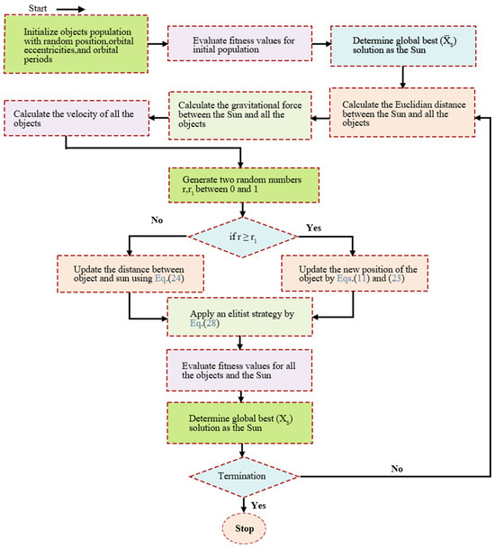 In the definition of solar mass , a random constant from 0 to 1 is generated to represent the planet’s mass value within the scatter search space. The function , which decreases exponentially with time to control the search accuracy, is defined as Formula (10):