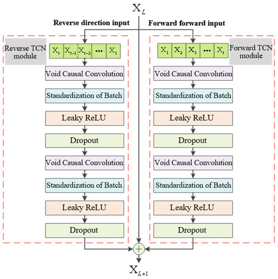 The dimensions of the temporal convolutional kernel for capturing time gaps, the parameter for the leaky ReLU activation function, the dilation rate for atrous convolution, and the parameter for dropout regularization are represented by , , , and , respectively. denotes feature extraction in the forward TCN module while describing feature extraction in the backward TCN module. The structure of BiTCN is shown in Figure 4.