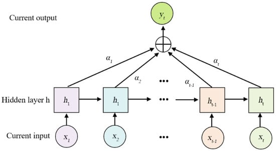 The attention mechanism is a computational approach that emulates the information processing mechanism of the human brain, thereby enhancing the information processing capability of neural networks. It selectively emphasizes important features by assigning weights to input features and applying weight distribution to retain intermediate results in neural network computations. This facilitates learning with a new model while reducing or disregarding the influence of irrelevant features, thus achieving effective information filtering, improving analysis efficiency, enabling better decision-making by models, and enhancing prediction accuracy. For short-term load forecasting tasks, models often need to process large volumes of load data within limited time frames. The value of the load at a specific moment is more closely related to nearby load values than those further away. Therefore, models should primarily focus on recent load values during prediction. This necessitates leveraging attention mechanisms. The attention mechanism can assign varying weights to each time point’s load value by giving higher weights to values closer in time and lower weights as they become more distant from the current time point. Consequently, models can effectively capture valuable information quickly and improve prediction accuracy. Figure 5 illustrates the structure of an attention mechanism representing an attention distribution vector.