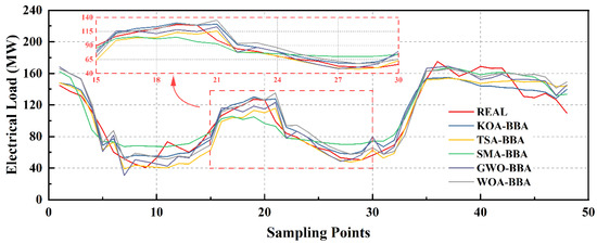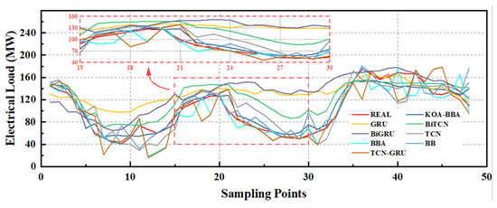 - A novel algorithmic model for short-term load forecasting in a 24-step multivariate time series has been proposed. This model combines KNN data imputation with BiTCN bidirectional temporal convolutional network along with a BiGRU bidirectional gated recurrent unit and attention mechanism. Furthermore, the model’s hyperparameters have been optimized using the Kepler adaptive optimization algorithm (KOA), resulting in enhanced prediction accuracy compared to equivalent time steps.