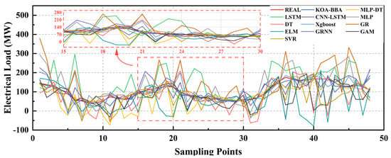 The KOA-BiTCN-BiGRU-attention model, with an execution time of 1764 s, outperforms other deep learning models optimized with TSA, SMA, GWO, and WOA by offering shorter run times while maintaining high predictive accuracy. Although it has a slightly higher computation time compared to classical models like XGBoost and Gaussian regression, KOA-BiTCN-BiGRU-attention excels in capturing complex time series patterns, especially in tasks involving nonlinearity and long-term dependencies. Its advanced feature extraction and sequence modeling capabilities make it superior in predictive accuracy, showcasing the significant value of deep learning for complex time series forecasting.