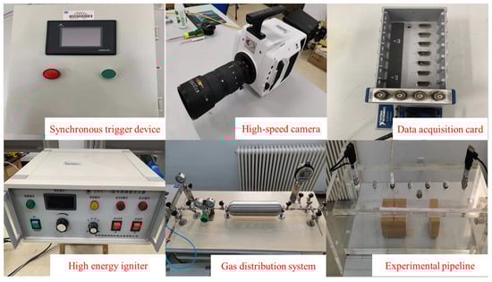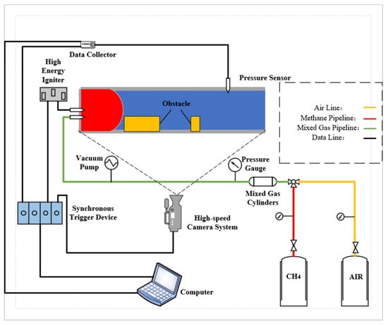 The experimental system consists of five parts: a rectangular experimental pipeline, an ignition device, a data acquisition system, a gas distribution system, and a synchronous triggering system. The rectangular experimental pipeline has an inner diameter of 820 mm × 160 mm × 160 mm, with a wall thickness of approximately 20 mm and a volume of about 21 L. One side of the pipeline is open to release high-temperature gases during experiments, while the other side is used to install the spark plug of the ignition device. The ignition device consists of a spark plug and a high-energy igniter, with an ignition voltage of 60 V and an ignition energy of 100 mJ. The data acquisition system includes pressure sensors, a data acquisition card, and a high-velocity camera. The PPM-127H pressure sensor used was manufactured by Nanjing Hongmu Co., Ltd. in Nanjing, China and has an exposed diaphragm and measuring range from −5 to 5 kPa. The data acquisition card is the Ni9234 card from the National Instruments, Austin, TX, USA. The high-velocity camera is from Phantom series produced by Vision Research, Wayne, NJ, USA. Due to the millisecond-level deflagration velocity of methane–air mixture, the experimental capture velocity is set at 1000 fps, with a camera resolution of 1280 × 800. The synchronous triggering device coordinates the operation sequence of the data acquisition card, high-velocity camera, and high-energy igniter. The gas distribution system consists of gas storage cylinders, digital pressure gauges, gas shut-off valves, pressure-reducing valves equipped with high and low-pressure gauges, and supporting brackets.