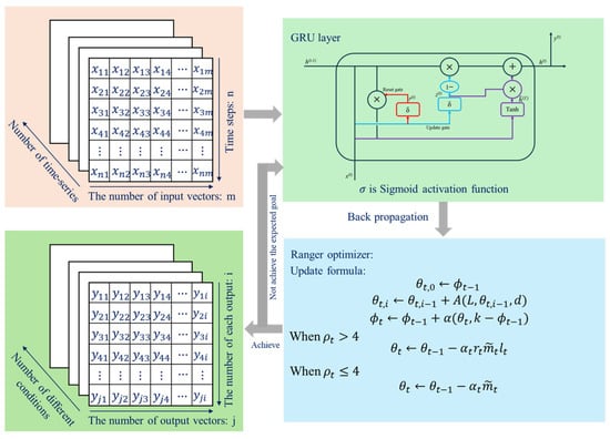 The proposed model consists of the GRU neural network, PReLU activation function, and Ranger optimizer. Firstly, the input data need to be preprocessed in three-dimensional temporal order according to the set GRU time step, which allows the GRU to extract the input data in chronological order during the training period. Second, the input data will enter the GRU neural network for operation, and the Ranger optimizer will adaptively adjust its own learning rate according to the results of the forward propagation during the backpropagation of the network in order to help the GRU find the optimal weights and thresholds value. Finally, when the prediction results do not reach the target accuracy, the input data will be re-input into the GRU for a new round of calculation. When the prediction results reach the target accuracy, GRU will end the training and output the prediction results.