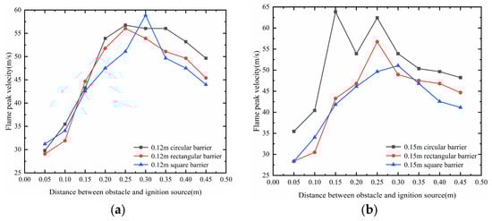 Single obstacle peak flame velocity diagram: (a) Length 0.12 m. (b) Length 0.15 m.