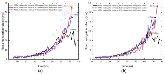 The flame propagation velocity comparison diagram under different ignition source distance conditions with the same obstacle: (a) Length 0.12 m. (b) Length 0.15 m.