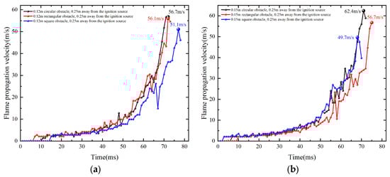Flame propagation velocity comparison diagram under same ignition source distance conditions with different shapes of the obstacle: (a) Length 0.12 m. (b) Length 0.15 m.