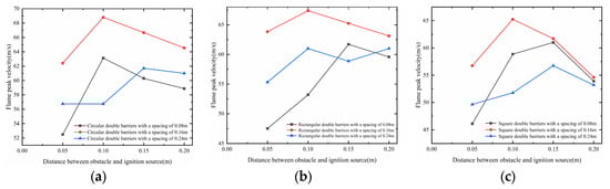 The peak flame velocity diagram for two obstacles condition: (a) Circular obstacle. (b) Rectangular obstacle. (c) Square obstacle.