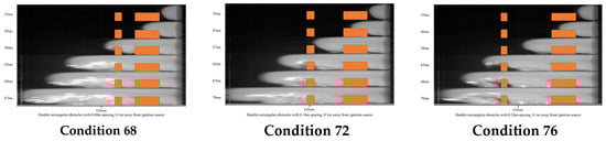 As shown in Figure 12, Figure 13 and Figure 14, when the flame contacts the first obstacle, it is initially subjected to the induced turbulence effect of the obstacle, which subsequently accelerates the flame burning velocity. When the distance between the two obstacles is 0.08 m, the flame is subjected to the turbulence effect of the second obstacle due to the close spacing between the obstacles. The increased pressure wave pushes most of the unburned gas out of the pipe, ultimately leading to a decrease in the peak flame velocity. When the distance between the two obstacles is 0.16 m, the flame has already fully accelerated. Upon encountering the turbulence effect of the second obstacle again, the flame continues to accelerate and ignites more unburned gas ahead, resulting in an increase in flame acceleration and ultimately a higher peak flame velocity. When the distance between the two obstacles is 0.24 m, the flame’s acceleration tends to stabilize upon reaching the second obstacle. With less unburned gas remaining in the pipe, the flame acceleration changes little, leading to a decrease in the peak flame velocity. Therefore, as the distance between obstacles increases, the peak flame velocity first increases and then decreases. The trend of peak flame velocity with obstacle spacing is generally consistent for obstacles of different shapes.