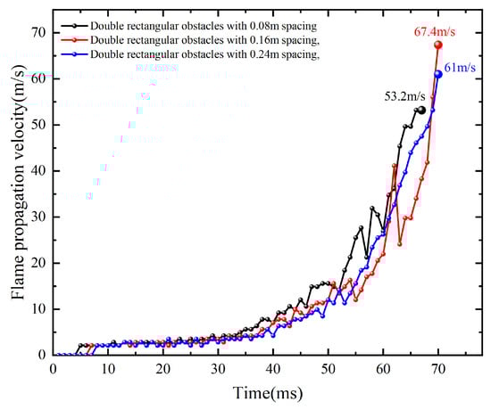 The flame propagation velocity comparison diagram under different distance between two obstacles condition.