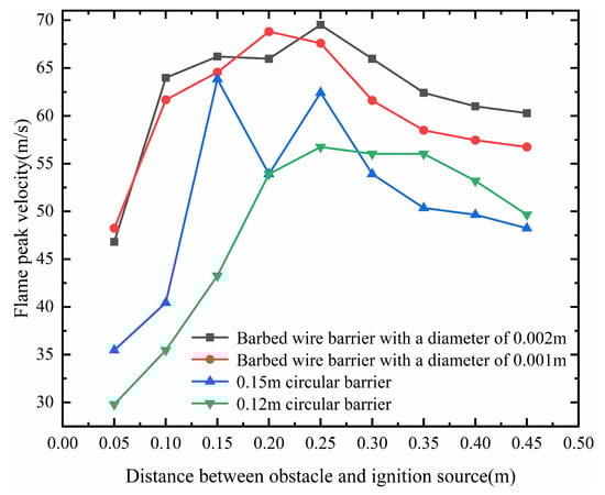 The peak flame velocity diagram under conditions of the barbed wire obstacle and the circular obstacle.