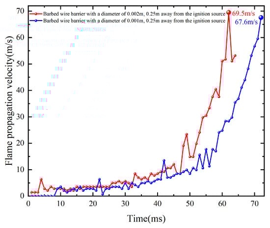 For the barbed wire obstacle, the diameters are 1 mm and 2 mm, and the length, width, and height of them are 0.12 m. As shown in Figure 15, Figure 16 and Figure 17, the barbed wire obstacle with a 1 mm diameter has more layers, resulting in a denser structure that increases the contact area with the flame. This dense structure causes more reflections of pressure waves upon contact with the surface of the 1 mm wire mesh. Additionally, the good thermal conductivity of the barbed wire obstacle allows the 1 mm diameter barbed wire obstacle to absorb more heat, preventing the complete ignition of the premixed gas behind it, and leading to flame quenching. The 1 mm-diameter barbed wire obstacle also has a finer three-dimensional porous structure, acting as a porous medium that rapidly attenuates the propagation of explosion waves. Consequently, the peak flame velocity under the 1 mm diameter barbed wire obstacle is lower than that under the 2 mm diameter barbed wire obstacle.