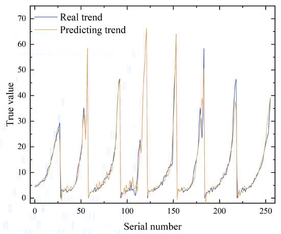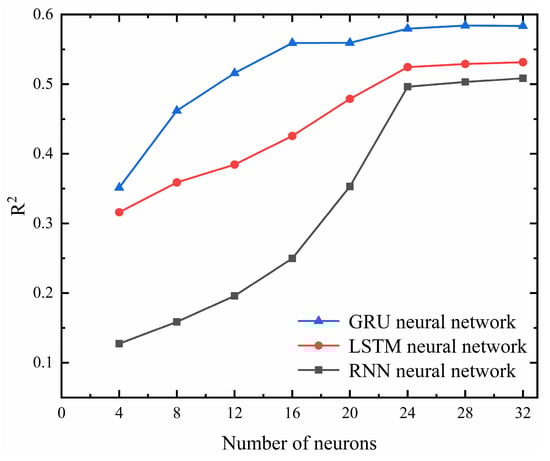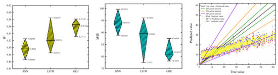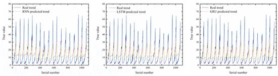 RNN, LSTM, and GRU all can predict temporal data. RNN is characterized by high prediction efficiency. LSTM is characterized by strong memory, high prediction accuracy, robustness, and no gradient disappearing problem due to the existence of three different gate control units inside the neurons. GRU has higher prediction efficiency compared to LSTM due to its simplified neuron internal structure, but its prediction accuracy may be reduced compared with LSTM. Therefore, to evaluate the prediction performance of the three neural networks in detail, the RNN, LSTM, and GRU neural networks were trained. During the training process, the number of neurons for the three neural networks was set to 24, the activation function was set to Sigmoid, and the optimizer was set to SGD; a neural network with the best prediction ability was selected as the prediction model by comparing the prediction value distribution, trend prediction, R2 mean value, and MSE mean value of the test set of the three neural network models.