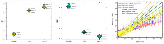 As shown in Table 5 and Table 6 and Figure 21 and Figure 22, when the activation function is Sigmoid, almost all predicted values fall outside the 25% error interval. Compared to the true trend, only a few predictions align. The R2 mean value is the lowest with the largest fluctuation, and the MSE mean value is the highest with the greatest fluctuation. When the activation function is Relu, predictions within the 25% error interval notably increase, though many values still exceed this range. Overall, most predictions align well with the true trend. The R2 mean value significantly improves with the lowest fluctuation, and the MSE mean value decreases noticeably with the lowest fluctuation as well. With PReLU as the activation function, the majority of predictions are within the 25% error interval. Compared to Sigmoid and Relu, there are fewer predictions outside this range. Most predictions align well with the true trend and, particularly within the range of true values from 30 to 50, the alignment improves notably compared to Relu. The R2 mean value is the highest with a moderate fluctuation, and the MSE mean value is the lowest with a moderate fluctuation. Therefore, PReLU was chosen as the activation function for GRU.