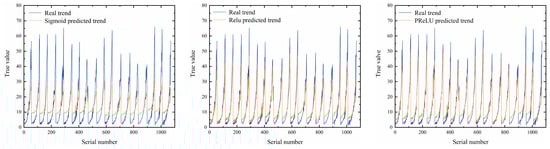 Activation function comparative analysis: the Sigmoid activation function is a saturating function, while Relu and PReLU activation functions are non-saturating functions. Moreover, Relu outputs zero for negative input values; thus, its output capability is limited compared to PReLU. Therefore, three activation functions—Sigmoid, Relu, and PReLU—are applied to the GRU neural network for training. By comparing the distribution of predicted values, trend predictions, and the R2 mean value and MSE mean value on the test set, the most compatible activation function with the GRU neural network was selected.