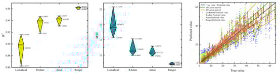 As shown in Table 7 and Table 8, as well as Figure 23 and Figure 24, when the optimizer is Lookahead, most predicted values are within a 25% error range, with fewer predictions within a 10% error range. Overall, the predicted trends mostly align with the true trends. The R2 mean value is the lowest with the highest fluctuation, and the MSE mean value and fluctuation are also the highest. When the optimizer is RAdam, most predicted values are within a 25% error range, and there is a noticeable improvement in predictions within a 10% error range compared to Lookahead. The overall predicted trends align well with the true trends, with significant improvements observed in the alignment in the 0–10 and 50–60 ranges compared to Lookahead. The R2 mean value increases, and both R2 and MSE fluctuations decrease. For the Adam optimizer, predictions within 25% and 10% error ranges show improvement compared to RAdam. The overall predicted trends align well with the true trends, with slight improvements in alignment observed in the 40–60 range compared to RAdam. The R2 mean value shows a slight increase, and both R2 and MSE fluctuations decrease. With the Ranger optimizer, almost all predicted values are within a 25% error range, with a majority within a 10% error range. The overall predicted trends align closely with the true trends, except for a few areas in the 45–60 range where there is partial alignment. The R2 mean value is the highest, with the lowest fluctuation, and both MSE mean value and fluctuation are also the lowest. As shown in Table 9 and Table 10, when the optimizer is Ranger, the R2 and MSE mean values of the training set are higher and lower than those of the test set, but the differences are not significant. This indicates that the proposed model does not suffer from overfitting. In addition, it can be seen that the dispersion of the R2 and MSE values obtained from the ten predictions of the training and test set is not large, where the dispersion ranges of R2 are 0.00572 and 0.00264 and the dispersion ranges of MSE are 0.85313 and 0.75461, which indicates that the proposed model has strong robustness in the process of predicting the data for the training set and the test set.