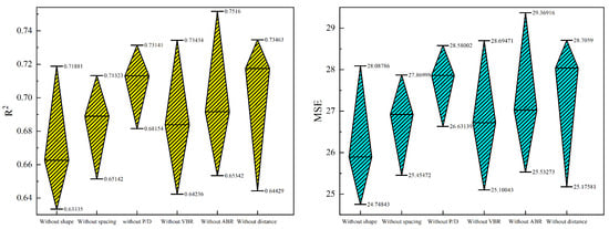 As shown in Table 12 and Table 13 and Figure 26, when a certain category of input vectors is deleted, the mean value of R2 and MSE decreases and increases, respectively, due to the reduction in the number of features. In addition, regardless of which class of input vectors is deleted, the mean values of R2 and MSE for the test set are similar, and there is little difference in the range of discretization. Therefore, all seven input vectors selected significantly affect the prediction accuracy of the model, and each type of input vector has almost the same degree of influence on the prediction results.