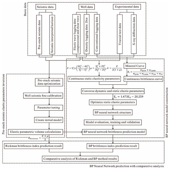 This study was based on the prediction results of rock elastic parameters such as Young’s modulus, Poisson’s ratio, and shear modulus by seismic pre-stack simultaneous inversion. The network model for predicting rock brittleness based on rock elastic parameters established by the BP neural network algorithm was used to realize the prediction method of the shale reservoir brittleness index, which mainly involves two core theories: pre-stack simultaneous inversion and the BP neural network.