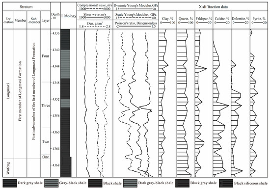 Brittleness index curve data for four target layers from the mineral method were obtained, with a total of 1970 consecutive brittle index data points, as shown in Figure 4. Figure 5 shows the X-ray diffraction data, compressional and shear wave curves, and elastic parameter data for well Z1.