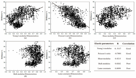 Correlation analysis of elastic parameters: (a) brittleness index and Young’s modulus intersection graph; (b) brittleness index and Poisson’s ratio intersection graph; (c) brittleness index and shear modulus intersection graph; (d) brittleness index and bulk modulus intersection graph; (e) brittleness index and Lame constants intersection graph.