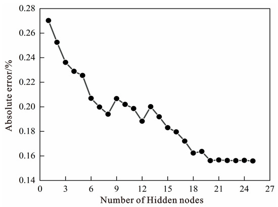 The trial-and-error method was employed to determine the number of neurons in the hidden layer. Analysis of the total error corresponding to different numbers of hidden layer nodes, with 20 nodes in the hidden layer, showed the absolute error reached 0.15616 (as shown in Table 1 and Figure 7). The absolute error tended to stabilize as the number of nodes continued to increase. Thus, the number of neurons in the hidden layer was selected to be 20.