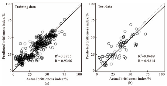 Correlation analysis between model training data, and test data: (a) correlation analysis between predicted and actual brittleness index of training data; (b) correlation analysis between predicted and actual brittleness index of test data.