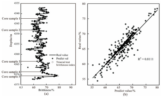 Model validation data were selected from the single well that was not included in the model training process to analyze and validate the effectiveness of the BP neural network brittleness index prediction model. The coefficient of determination (R2) was used to assess the model’s predictive performance by analyzing the correlation between predicted and actual values from this well.