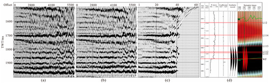 High-quality pre-stack seismic data were obtained by applying super-gather processing techniques to the original CDP gathers (Figure 10a). The Super CDP gathers (Figure 10b) were then converted into AVA gather data for pre-stack simultaneous inversion (Figure 10c). In the comparison of the original CDP gathers in Figure 9 with the optimized Super CDP gathers, gather quality was significantly improved, and the signal-to-noise ratio was significantly increased. The target layer in the synthetic seismic record from a single well showed strong amplitude peak reflection (Figure 10d).