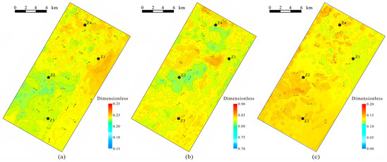 The plane diagrams of pre-stack simultaneous inversion of elastic parameters data volumes: (a) the plane diagrams of Young’s modulus data volume; (b) the plane diagrams of Poisson’s ratio data volume; (c) the plane diagrams of shear modulus data volume.