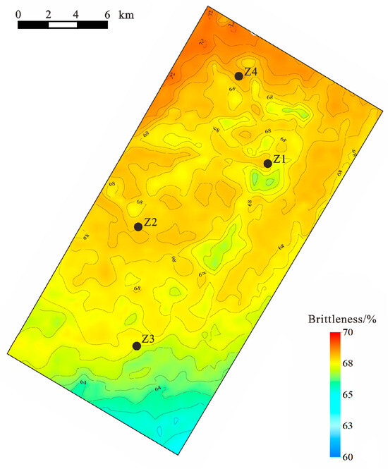 The predicted data volumes of Young’s modulus, Poisson’s ratio, and shear modulus from the pre-stack inversion were inputted into the constructed neural network model to obtain the brittleness index prediction results. Figure 12 shows the distribution of these predicted results. Analysis of the BP neural network’s prediction of the brittleness index showed the average brittleness index was between 60% and 70%, and the brittleness index gradually decreased in a northwest-to-southeast pattern.