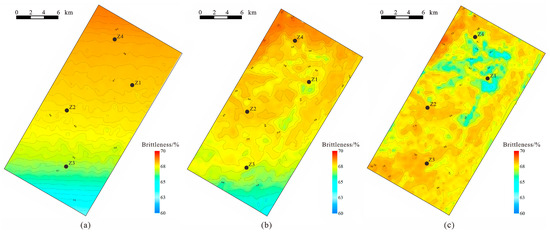 To recognize the differences between the BP method and the traditional method, the predicted brittleness index results of the conventional Rickman method were compared with the BP neural network method. The analysis of the two methods for predicting the brittleness index and the interpolation of the wellbore brittleness data plane showed that the actual mineral brittleness index plane diagram (Figure 13a) was consistent with the BP neural network method brittleness index prediction results (Figure 13b). The average brittleness index of the wells was between 60% and 70%, and the brittleness index plane diagram showed a trend of decreasing from northwest to southeast. The predicted plane diagram of the conventional Rickman method’s brittleness index (Figure 13c) has gaps compared with the actual well-point brittleness index data plane diagram.
