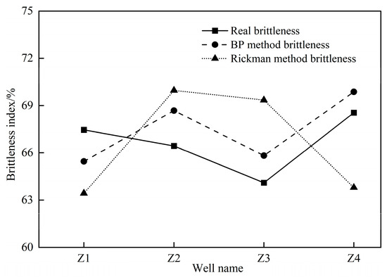 Three rock elastic parameters in 367 groups of data points of well Z4 that were not involved in model training and system testing were used as input, and the brittleness index output by the neural network was compared and analyzed with the corresponding actual brittleness index. As can be seen from Figure 9, the brittleness index of five core samples based on triaxial test data is similar to the real brittleness index of minerals and the predicted brittleness index data of the BP method, indicating that the real and predicted values of the brittleness index can be used to verify and evaluate the prediction results of the brittleness index. The predicted value of the longitudinal brittleness index of well Z4 in the study area obtained by using the BP neural network model has a high matching degree with the real value, and the correlation coefficient of prediction of 367 data points of well Z4 is 0.811. The neural network model established in this study has a good consistency.