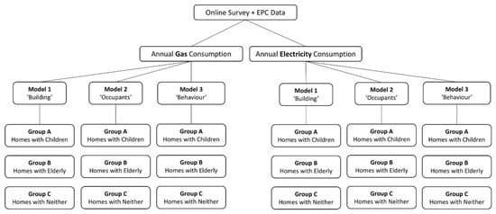 The dataset was divided into three household groups: Group A. Homes with children (n = 1576), Group B. Homes with elderly (n = 436), and Group C. Homes with neither children nor elderly (n = 2330). Gas and Electricity consumption are the two dependent variables analysed in this study; the same analysis was undertaken for each of these consumption data. The analysis undertook three Lasso Regression Models, each looking at the 3 different aforementioned models; ‘Building’, ‘Occupants’ and ‘Behaviour’. The models were repeated for the three household groups, allowing comparisons between groups and between gas and electricity consumption. The data analysis framework is summarised in Figure 1.