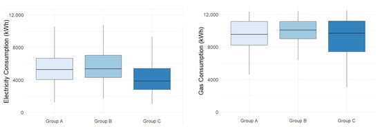 The first step of the analysis was to review the variability in electricity and gas annual consumption between household groups; ‘Group A—With Children’, ‘Group B—With Elderly’ and ‘Group C—With Neither’. Although little difference in central tendency was observed, there was a significant difference between groups, with households with elderly residents consuming more energy. This analysis led to the review of the energy consumption predictors of each household group.