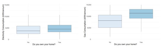 In the UK, 63% of households own their place of residence [53], but within this survey, 75% (n = 3688) of participants stated they owned their home. This higher rate demonstrates how the sample is not truly reflective of the UK. It can be expected that, with this higher rate of ownership along with the aforementioned opportunities homeowners have to implement upgrades, energy consumption may be lower in the survey than that of the UK average household. However, this study’s results show the opposite with the owned group representing larger average energy consumption than non-owners (both for gas and electricity), see Figure 3. This may be because other variables are affecting energy consumption. The average floor area in the sample is 117sqm, whereas the UK average is lower at 97sqm [55]. This will likely mean that energy consumption is higher within the study results than would be expected based on UK averages. Similarly, the average income for a household in the UK is £35K [56], whereas 40% of the sample falls within the ‘greater than £60K’ category. This implies that participants have on average more disposable income and are less constrained to consume energy, thus the energy consumption data is higher than expected.