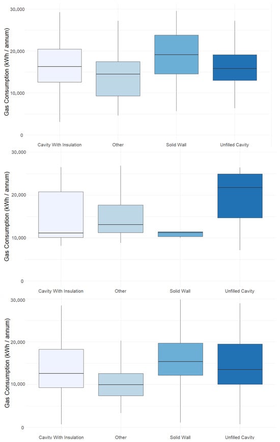 Variable ‘Wall construction’ vs. Gas consumption in kWh/annual for ‘Group A—With Children’ (top), ‘Group B—With Elderly’ (middle) and ‘Group C—With Neither’ (bottom).
