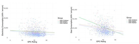 It can be seen from Figure 5 that the regression lines in the electricity graph maintain the same position as the EPC rating increases. Homes with elderly consistently consume more electricity. but as the EPC improves, the gap between the three regression lines increases, suggesting that having dependents in the home limits the potential energy saving that may come by living within a high-performing home. The gas consumption graph on the right shows that having elderly in a poor-performing home will mean gas consumption is significantly higher than the two other groups, but this improves strongly as the EPC improves until having elderly in the home means that energy consumption will be less than the other two groups (A and C). The two regression lines of groups A and C maintain a consistent position and steepness to each other throughout the EPC rating range.