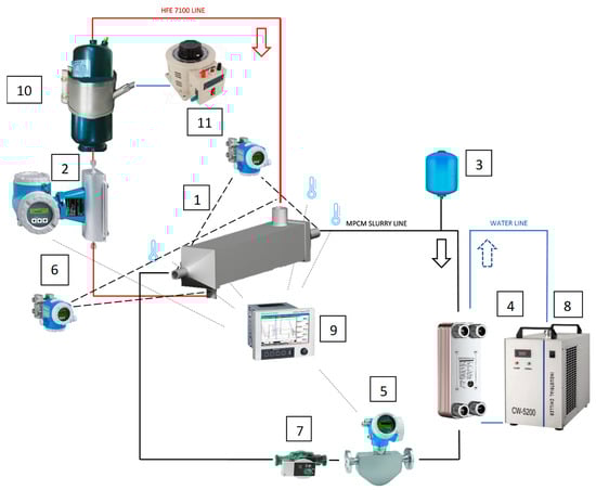 Pictorial scheme of the test stand: 1, 3D heat exchanger; 2, heating fluid mass flow meter; 3, mPCM fluid storage vessel; 4, plate heat exchanger; 5, cooling fluid mass flow meter; 6, differential pressure sensor; 7, pump; 8, cooling unit; 9, data recorder; 10, heated refrigerant storage vessel; 11, autotransformer.