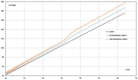 Water and an aqueous solution comprising microencapsulated phase change materials in two concentrations were used as the cooling mediums. The constant flow rate of the refrigerant was obtained by regulating the thermal flow parameters of the coolant. The authors’ previous studies presented all refrigerant HFE7100 and mPCM slurry properties, i.e., specific enthalpy (Figure 4) [26,27,28,29,30,31]. Furthermore, the figure shows the beginning (25 °C) of the melting transformation process of the microcapsule content (paraffin). The moment when the paraffin completely takes on the liquid phase is also clear for t = 28 °C. It can also be seen that the process becomes more intensive with the increase in the concentration of mPCM in the slurry.