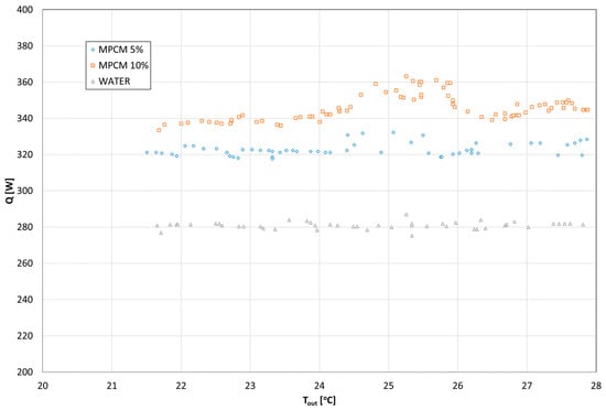 - The thermal power strongly depends on the type of coolant. The highest values were observed during cooling with a 10% mPCM slurry. The lowest heat flux values were noted for water cooling. It was also found that the heat flux increases during the PCM phase transition. The influence of mass share on the value of heat flux was also observed. The higher the mass fraction of mPCM in the mixture, the greater the heat flux.