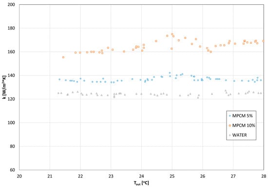 As shown in Figure 6, the OHTC depends on the type of cooling medium. The lowest values were observed during water cooling (k ≅ 120 W/(m2·K)). The highest overall heat exchange coefficient values were noted for cooling with 10% mPCM slurry (k ≅ 160 W/(m2·K)). It was also found that the overall heat exchange coefficient increased during the PCM phase transition. For 10% mPCM, there was an increase of over 11% in the overall heat exchange coefficient (k ≅ 175 W/(m2·K). The influence of mass share on the value of heat flux was also observed. The higher the mass fraction of mPCM in the mixture, the greater the heat flux. It follows from the above that the addition of the phase change material mixture to the cooling medium intensifies the heat exchange in the heat exchanger. Thus, it can be assumed that there is an additional turbulence effect due to the presence of microcapsules in the flowing mixture.
