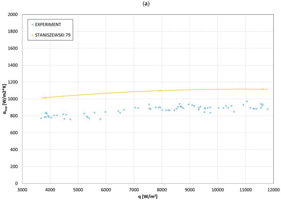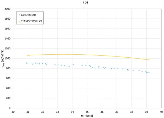 Using Formulas (1) and (2), the quantities characterizing the condensation of the refrigerant on the tubes’ external surface inside of the heat exchanger were determined. This allowed us to develop the internal characteristics of the condensation process. Figure 7 shows the dependence of the HTC for refrigerant condensation on the tube bundle surface, depending on the q heat flux density and the difference in the saturation and channel wall temperatures (ts − tw). The increase in the heat flux density slightly affects the value of the heat transfer coefficient during the condensation of the refrigerant (from the value of αexp ≅ 800 W/(m2·K) for q = 4000 W/m2, up to αexp ≅ 900 W/(m2·K) for q = 12,000 W/m2). This is consistent with the literature data for the condensation process, where some researchers assume that, during the condensation process, the HTC coefficient does not depend on the heat flux density. Furthermore, the increase in the difference in the saturation and channel wall temperatures (ts − tw) causes a slight decrease in the value of the heat transfer coefficient within the limits given above.