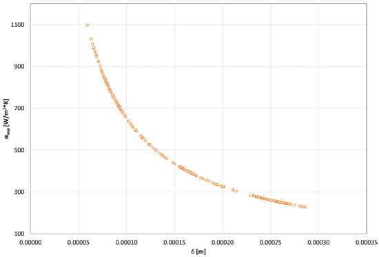 Figure 8 shows the dependence of HTC on the refrigerant’s condensate thickness. It was noted that the HTC values decrease significantly, ranging from 0.00003–0.001 m of the condensate film thickness in the range of 1100–200 W/(m2·K). This is obvious, because, during heat conduction through condensate, the thermal resistance of this condensate depends primarily on its thickness. The thicker the condensate film, the greater the resistance and the smaller the heat flow.