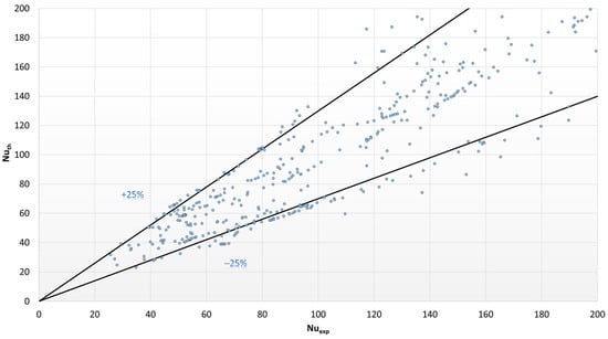 Expression, Nuth, is the Nusselt number determined from the correlation calculations of individual authors, whereas Nuexp is the Nusselt number value determined experimentally, and n is the number of measurements made. Over 68% of the entire data are in the range of ±25% (Figure 11).