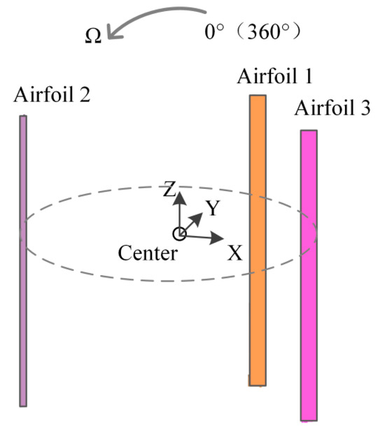The H-VAWT model is based on a design from Uppsala University, as comprehensive field experiment data are available [19,20]. The detailed parameters of the H-VAWT are outlined in Table 1, and the numerical model is shown in Figure 1. The rotor shaft and blade bracket are excluded from the numerical model to create high-quality structured grids [21]. Figure 2 shows the top view of the model along with an analysis of blade speed.