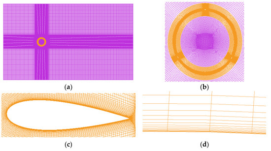 Grid division within the computational domain. (a) Overall view of the domain. (b) Interface grids. (c) Grids around the airfoil. (d) Boundary grids (The purple color means Stationary domain and the orange color means Rotating domain).
