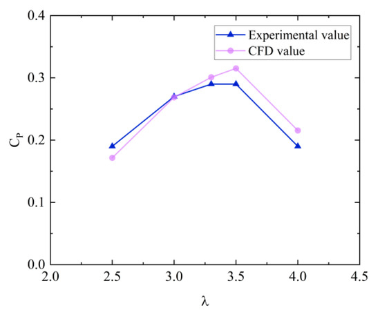 To verify the reliability of the numerical calculations, the power coefficient was computed under different tip speed ratios () and rated rotational speeds by varying the incoming wind speed (). The working condition settings are detailed in Table 3. The errors between these calculated values and experimental results were compared as shown in Figure 5. The error between the calculated results and the experimental data [19] is less than 10%, indicating that the calculation method is accurate.
