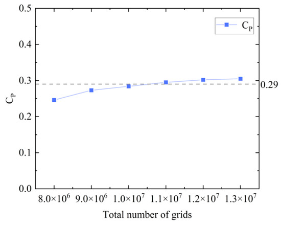 To verify the accuracy of the turbulence model and computational grid, experimental results were used as a reference [19]. The grid independence of the numerical calculations was assessed under the conditions of , a rotational speed () of 127 rpm, and an incoming wind speed of 12 m/s. Since the grid size near the blade significantly impacts the accuracy of the results, particular attention was given to the number of grid nodes near the airfoil during the grid independence verification [34]. The results of the grid independent validation are shown in Figure 6. To balance accuracy and computational efficiency, this study employs 200 nodes on the airfoil surface and 30 boundary layers; the total number of grids is .