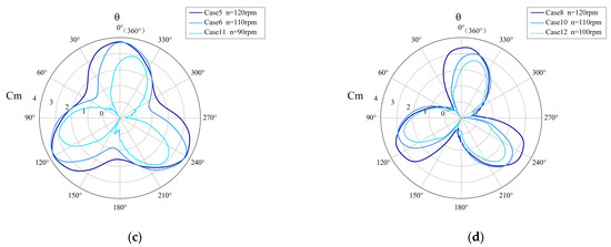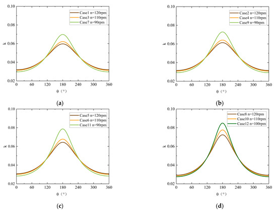 Figure 10 shows the variation of the with . The trend of is the same as that of . When , the angle at which obtains the extreme value lags behind . However, when , the angle at which obtains the extreme value precedes . For and at the same rotational speed , shows an increasing trend as and increase. For every 1% increase in , the maximum increase in is 20%, and the maximum increases in are 18%. When and remains constant, begins to decline as and increase, and the growth rate of slows down. exhibits significant changes during the startup phase when , which in turn affects . In the startup phase, the rapidly changing blade angle may cause flow separation, forming vortices and turbulence. These unstable flow field structures significantly impact lift and torque.